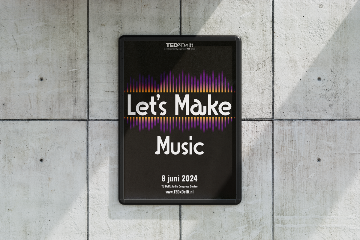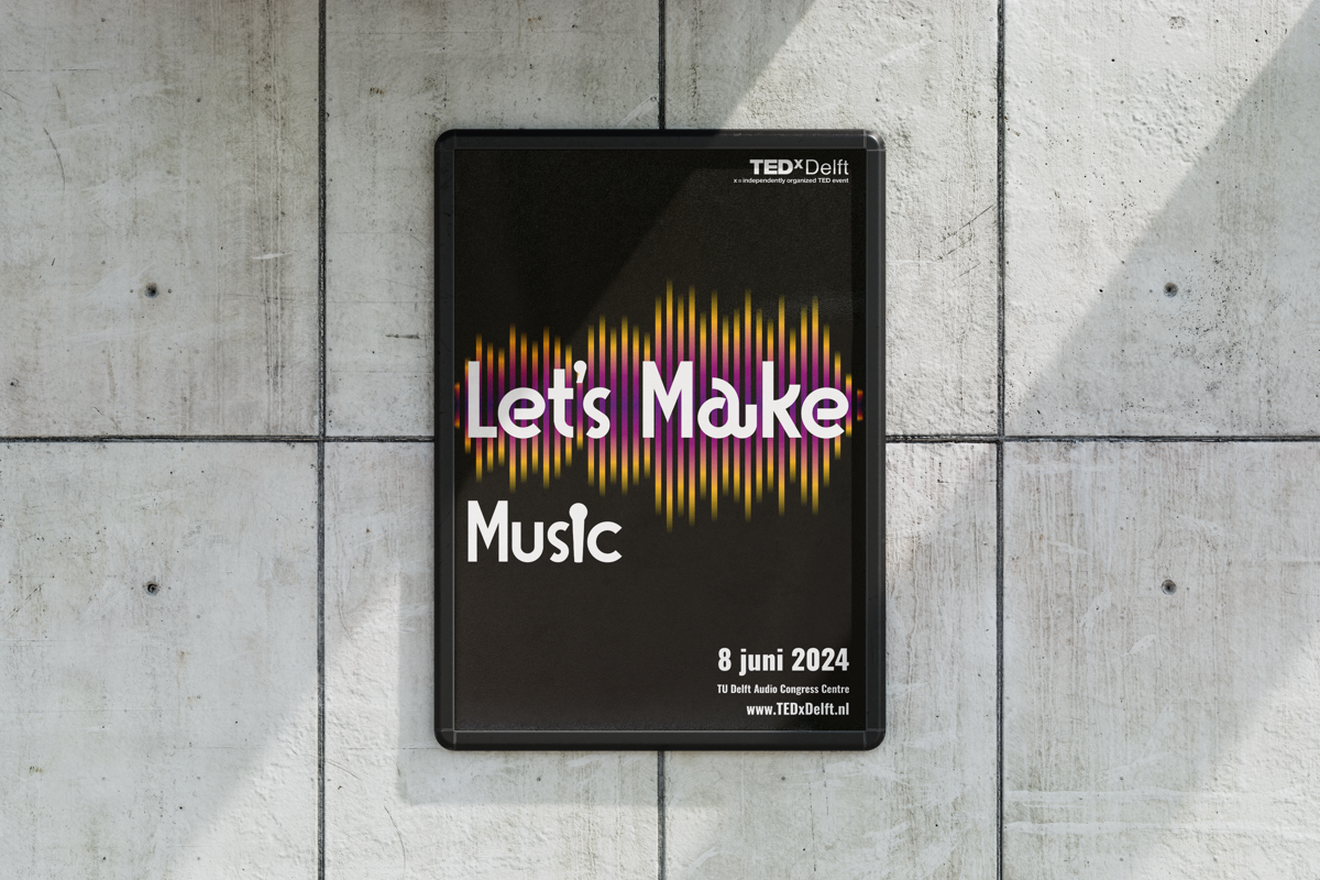 Voor het vak Contextual Concepting moesten we voor TEDxDelft een zelfbedacht event of een sprekerssessie ontwerpen, inclusief de bijbehorende visuele stijl. Mijn concept had als thema Let’s Make Music, waarbij ik het idee van geluid en ritme centraal stelde. Vanuit dit uitgangspunt onderzocht ik hoe abstracte elementen zoals klank en tempo vertaald kunnen worden naar een visuele identiteit. Geluidsgolven vormden hierbij de basis en kwamen op verschillende manieren terug in de stijl, zowel grafisch als conceptueel, om zo een samenhangend en herkenbaar geheel te creëren dat past bij de dynamiek en inspiratie van TEDx.